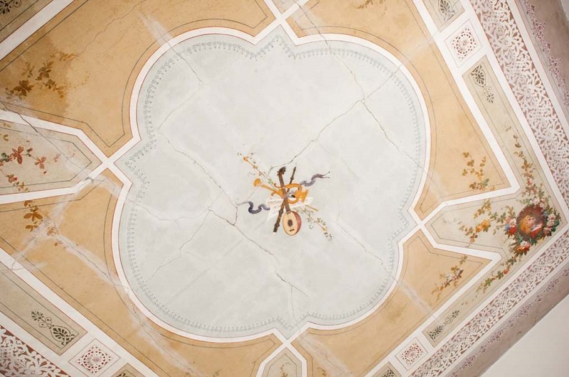 Quest'arte a cui probabilmente in origine si doveva la funzione di questo locale viene raccontata nel soffitto affrescato. Vi sono liuto, lira, flauto e spartito al centro ad indicare forse la storicità e le sue origini, mentre ai quattro angoli in medaglioni, ritratti probabilmente di figure legate all’opera, visi che abbracciano un discorso più contemporaneo all'epoca della villa stessa. A congiunzione tra passato e presente una curiosa continuità: un antico mobile in legno lavorato (con alzata di specchi a piombo e vetrinette) che esponeva pasticcini al bar-pasticceria dei bisnonni Ferdinando e Clementina alla stazione di Busto Arsizio, è attualmente collocato proprio in questa stanza. Nessun altro posto poteva sembrarci più adatto e significativo!
